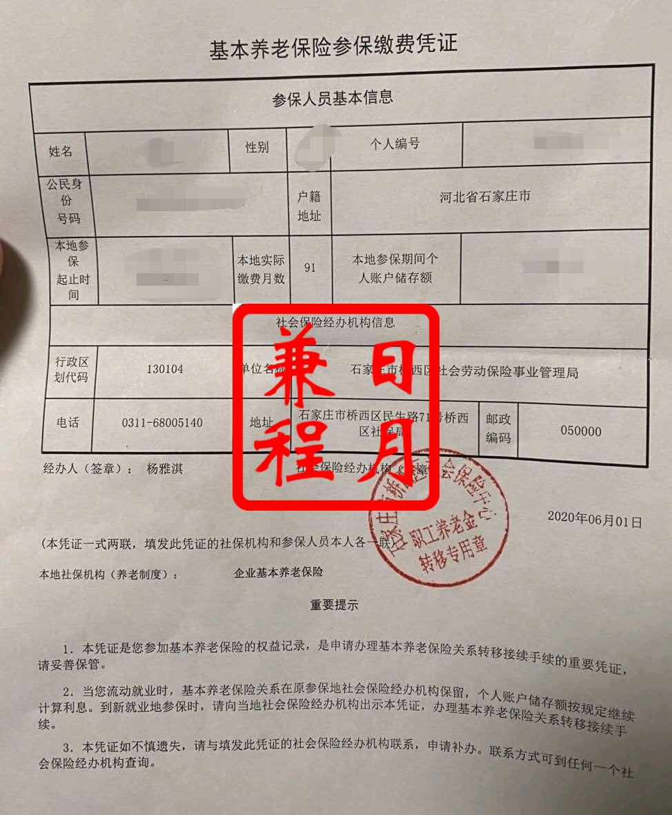 石家庄社保转移 养老保险和医疗保险转出凭证打印代办案例