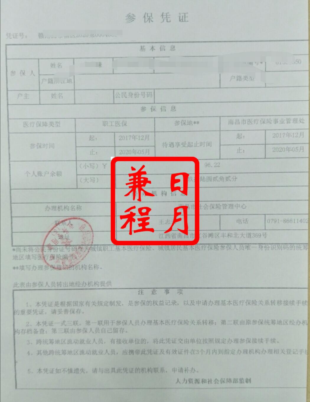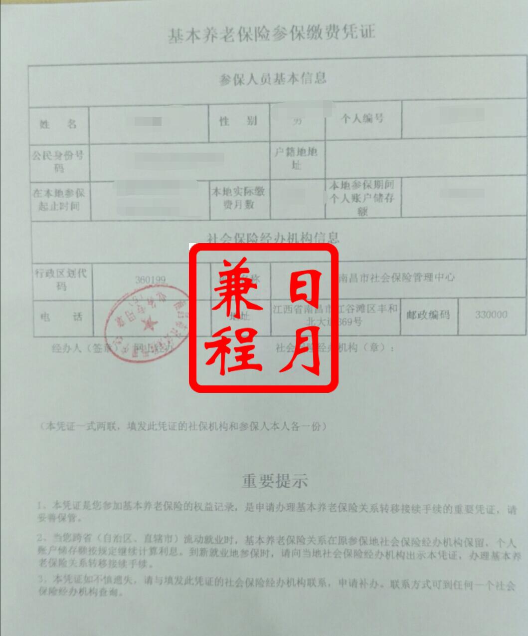 南昌社保转移打印养老保险和医疗保险跨省市社保转出参保缴费凭证案例