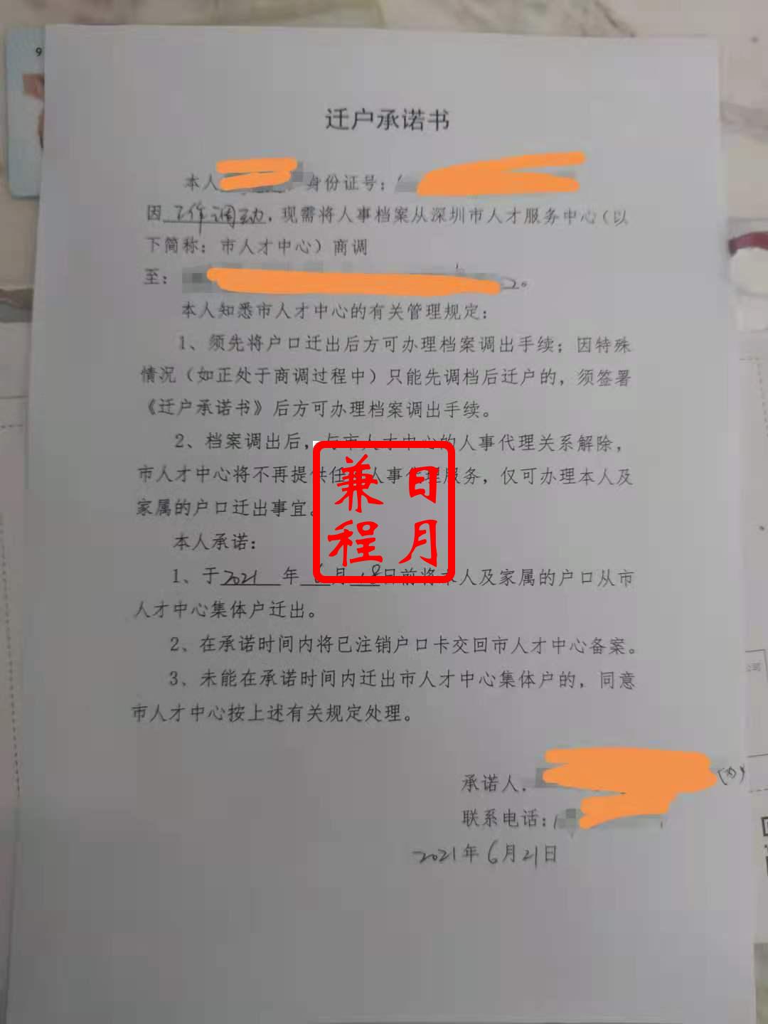 深圳市人才服务中心档案转出户口迁出承诺书代办案例