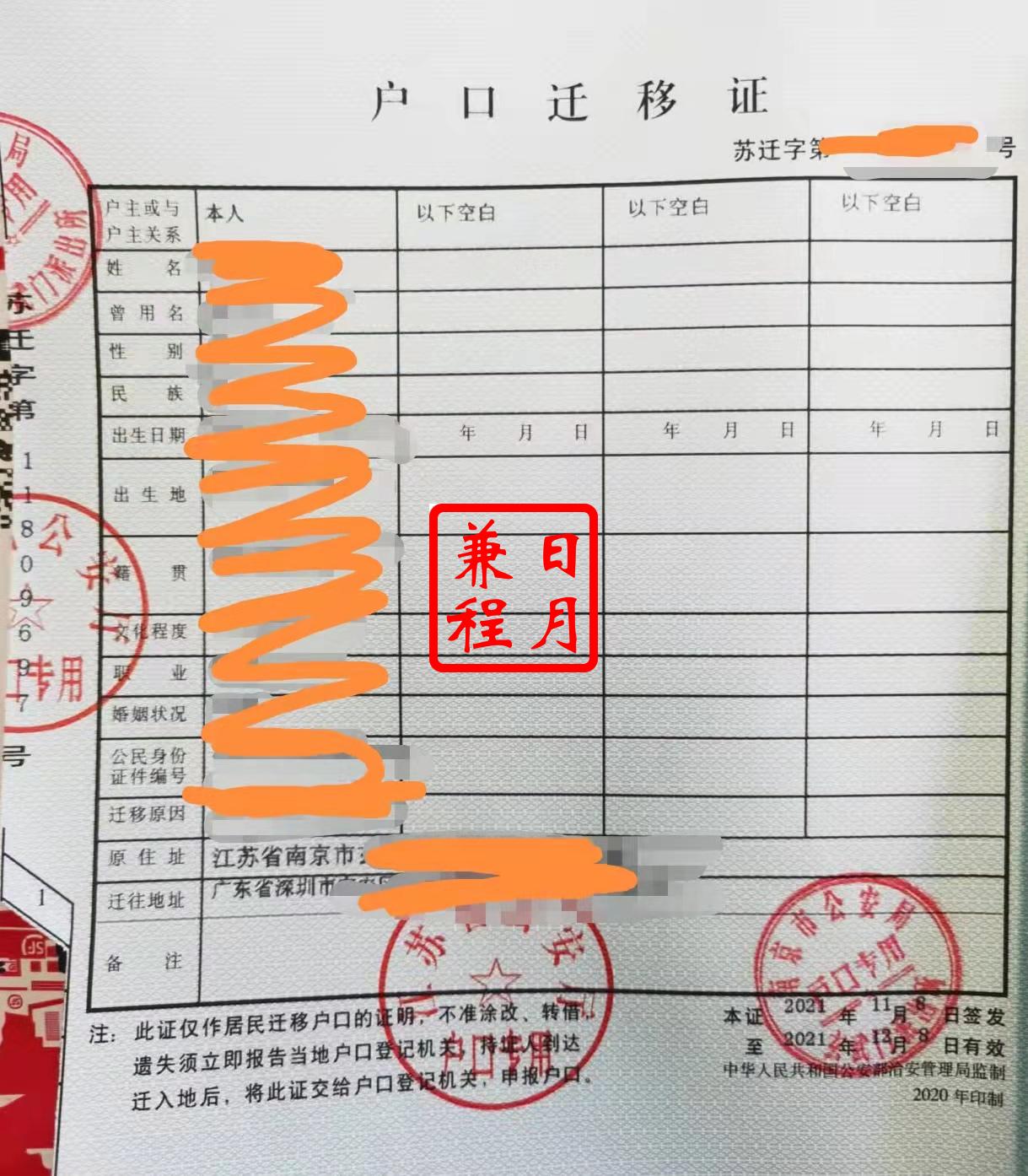 南京市玄武区玄武门派出所户口迁移证代办案例