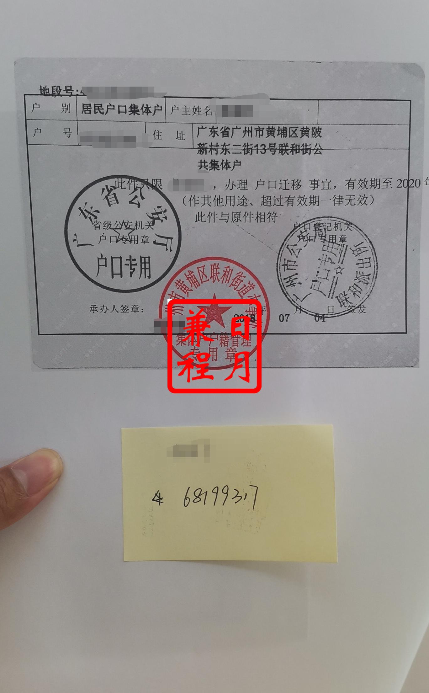 广州黄埔联和街道办借还户口卡户主页盖章复印件案例